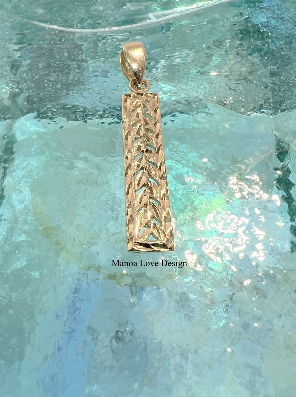 14k solid gold maile leaf cutting Hawaiian bar pendant