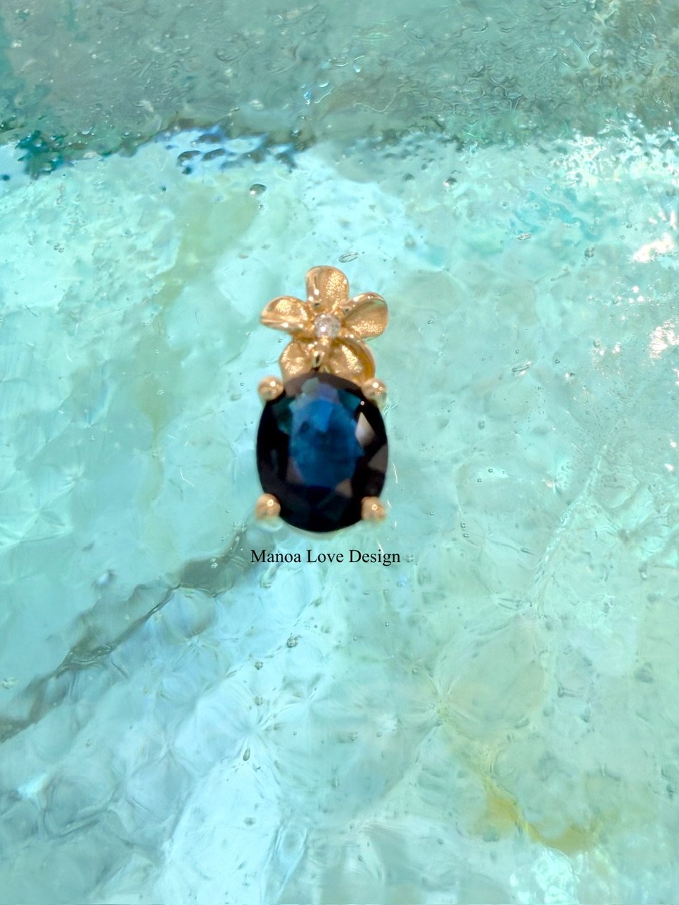 $650→$520(20% OFF) 14k solid gold plumeria with diamond oval sapphire pendant